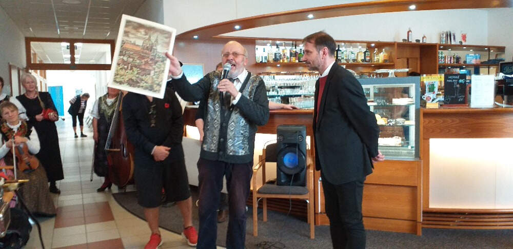 5) Starosta Bechyně, Štěpán Ondřich, získal originální litografii Prahy od Marko Čermáka. Překvapilo ho, že slavný kreslíř Rychlých šípů umí i jiné věci.