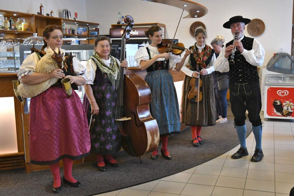 7) Než se lidé ohřáli nad obrazy, zahrála Pošumavská dudácká kapela. Ke konci vernisáže se nejen zpívalo, ale klaplo to i s tancem.